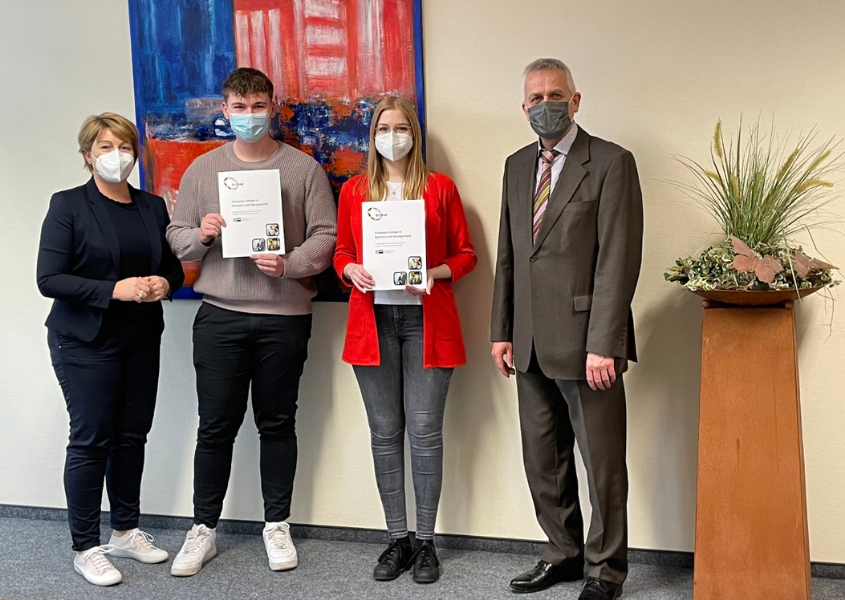 Justin Hennemeier und Carla Bergmann, Auszubildende des Bildungsgangs Kaufleute für Büromanagement haben in den Herbstferien die IHK Zusatzqualifikation „Kaufmann/-frau International“ am European College of Business and Management (ECBM) absolviert. Aufgrund der Corona Pandemie fand die Zusatzqualifikation in diesem Jahr online und nicht am ECBM in London statt. Aus zwei Wochen Aufenthalt in London wurden somit drei Wochen „Zoom Calls“.